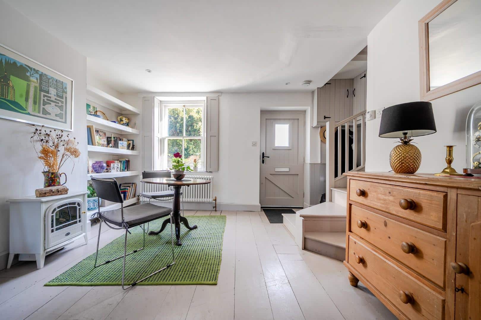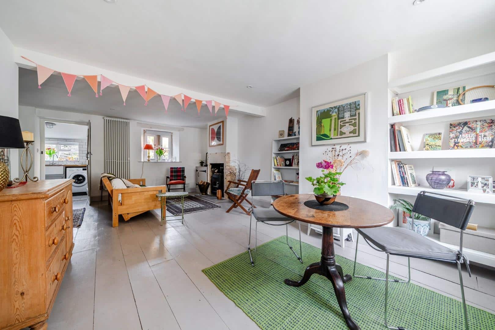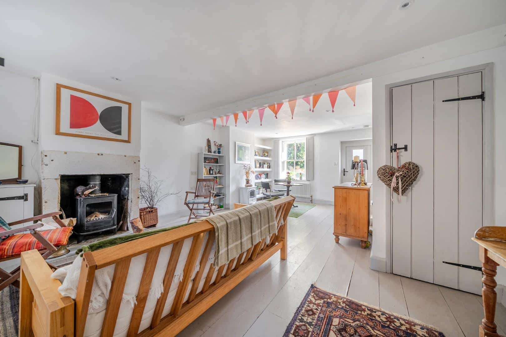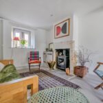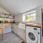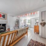 As you enter the property, you are welcomed into a bright and spacious dual-aspect reception room. This open-plan living area is filled with natural light and offers a warm, inviting atmosphere, enhanced by a charming log burner and useful built-in storage. The space flows seamlessly through to a modern, well-appointed kitchen, which features a gas hob, a traditional Belfast sink, and generous cupboard space for storage. From here, a characterful stable-style door opens out onto the patio, providing easy access to the garden and creating a lovely connection between the indoor and outdoor living spaces.