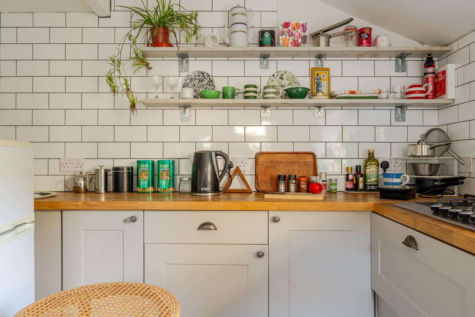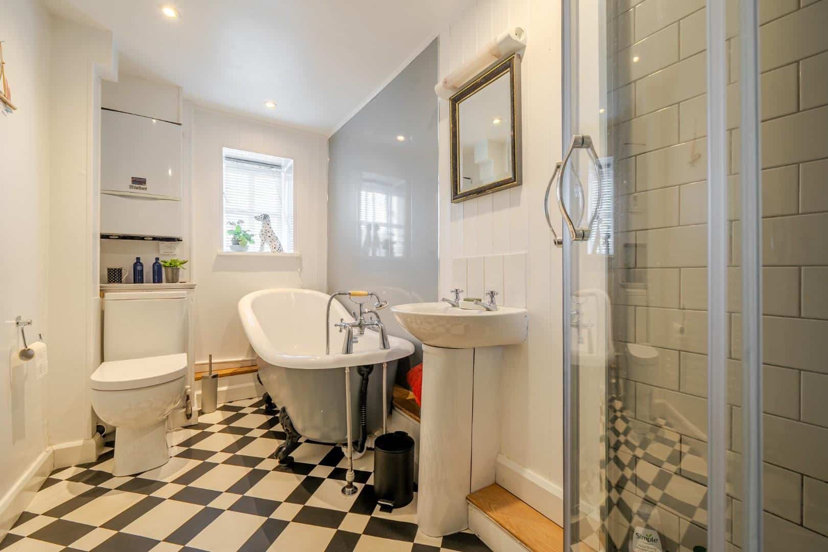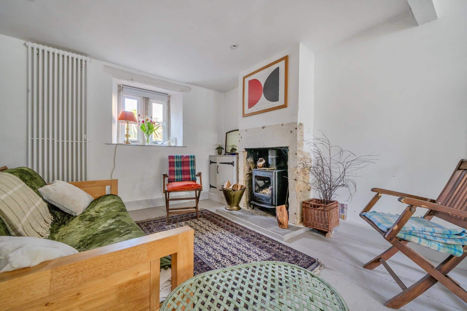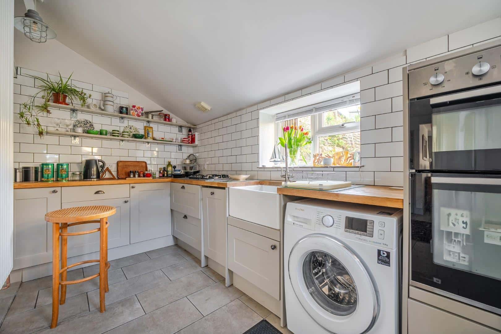 As you enter the property, you are welcomed into a bright and spacious dual-aspect reception room. This open-plan living area is filled with natural light and offers a warm, inviting atmosphere, enhanced by a charming log burner and useful built-in storage. The space flows seamlessly through to a modern, well-appointed kitchen, which features a gas hob, a traditional Belfast sink, and generous cupboard space for storage. From here, a characterful stable-style door opens out onto the patio, providing easy access to the garden and creating a lovely connection between the indoor and outdoor living spaces.